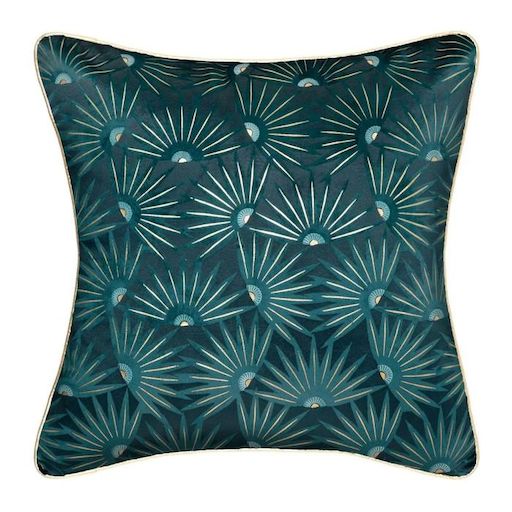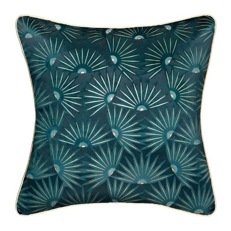 Informations Techniques : Dimensions : L. 40 x l. 0,5 x H. 40 cm Matière : Polyester Spécificités : Tendance & Pratique Housse de Coussin Forme Carrée Déhoussable Type de Finitions : Passepoil or Imprimé altique & or Poids : 0,1 kg Couleur : Bleu Canard