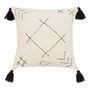 Informations Techniques : Dimensions : L. 40 x l. 40 x H. 1 cm Matière : Coton Spécificités : Lavable & Tendance Housse de coussin Avec 4 pompons Motifs surpiqués éthniques Forme carrée Densité : 80 fils/cm2 Poids : 0,2 kg Couleur : Beige