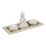 Informations Techniques : Dimensions : L. 34 x l. 14 x H. 14,5 cm Bouddha : H. 13 cm Plateau : L. 34 x l. 14 x H. 1,5 cm Photophore : D. 8 x H. 3 cm Matières : Ciment & MDF Spécificités : Tendance & Moderne Jardin Zen Contient : 1 Bouddha 1 Plateau 2 Photophores en forme de Fleurs Compatible avec 2