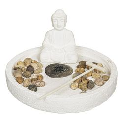 Informations Techniques : Dimensions : D. 18 x H. 9 cm Plateau : D. 18 x H. 2,5 cm Bouddha : H. 8 cm Râteau : L. 12 cm Matières : Ciment, Pierre & Sable Spécificités : Tendance & Moderne Jardin Zen Déco A Poser Contient : 1 Plateau 1 Bouddha 1 Râteau Des Galets Poids : 0,723 kg Couleur : Blanc
