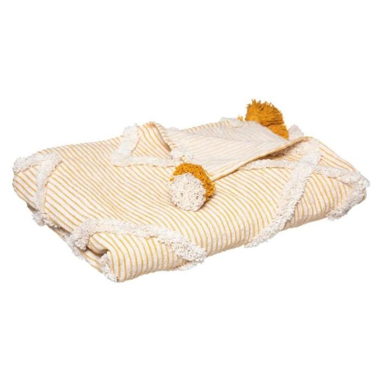 Informations Techniques : Dimensions : L. 180 x l. 130 x H. 1 cm Matière : Coton Spécificités : Doux & Chaud Jeté de Lit Forme Rectangulaire Avec Pompons Motif Rayé Effet Tufté Poids : 0,895 kg Couleur : Ocre & Beige