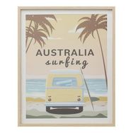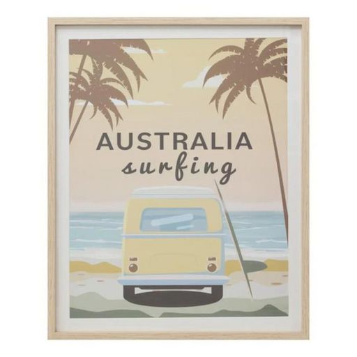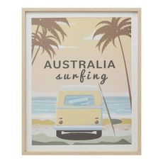 Informations Techniques : Dimensions : L. 41,5 x l. 2,2 x H. 51,5 cm Toile : L. 50 x l. 40 cm Matières : Verre & MDF Spécificités : Pratique & Utile Affiche murale Motif van Inscription Australia surfing Forme rectangulaire Poids : 1,64 kg Couleur : Beige