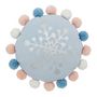 Informations Techniques : Dimensions : D. 33 x H. 8 cm Matières : House de taie : Coton Rembourrage : Polyester Spécificités : Original & Tendance Coussin déco enfant Imprimé flocon de neige Forme ronde Poids : 0,25 kg Couleur : Bleu