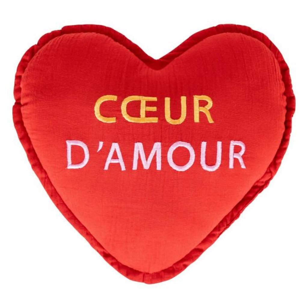 Informations Techniques : Dimensions : L. 40 x l. 40 x H. 10 cm Matières : Polyester & Coton Spécificités : Déco & Lavable Coussin en forme de cœur Inscription Cœur d'amour Poids : 0,24 kg Couleur : Rouge