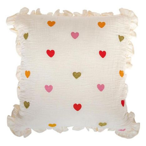Informations Techniques : Dimensions : L. 40 x l. 40 x H. 10 cm Matière : Gaze de Coton Spécificités : Déco & Tendance Coussin enfant carré Motifs cœurs brodés Avec volants festonnés Fermeture zippée Déhoussable et lavable Poids : 0,39 kg Couleur : Beige