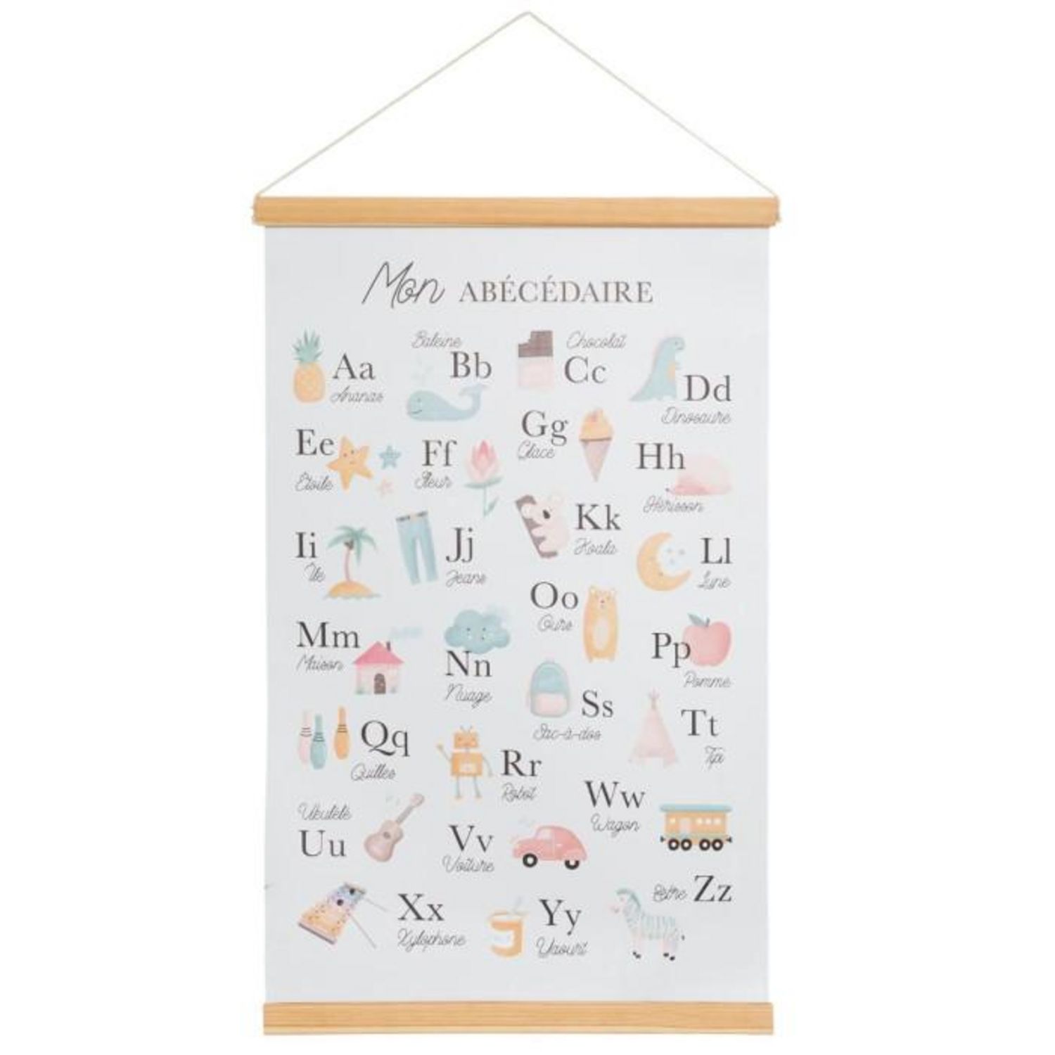 Informations Techniques : Dimensions : L. 40 x l. 4 x H. 60 cm Matières : Bois (Pin) & PVC Spécificités : Tendance & Moderne Décoration Murale Pour Enfant Représentation de l'Alphabet & des tables de multiplication A Suspendre Facile d'Entretien & d'Utilisation Poids : 0,3 kg Couleur : Multicolore
