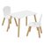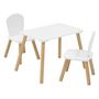 Informations Techniques : Dimensions : L. 58 x l. 38 x H. 43 cm Matières : Plateau : MDF Structure : MDF & Bois (Pin) Piètement : Bois (Pin) Spécificités : Pratique & Utile Table enfant Avec 2 chaises Finition hydrofuge À monter soi-même Poids max supporté : 50 kg Poids : 7,45 kg Couleur : Blanc