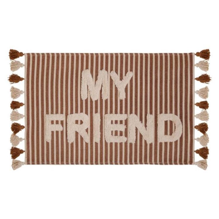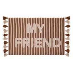 Informations Techniques : Dimensions : L. 90 x l. 60 x H. 2 cm Matière : 100% Coton (800 g/m2) Spécificités : Déco & Cosy Tapis enfant antidérapant Effet laine Inscription tuftée My friend Pompons aux extrémités Poids : 0,64 kg Couleur : Marron