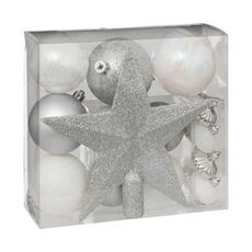 Informations Techniques : Dimensions : L. 20 x l. 2,5 x H. 21 cm Matière : Plastique Spécificités : Déco & Festif Kit 18 pièces déco de Noël 17 boules & 1 cimier Poids : 0,19 kg Couleur : Argent