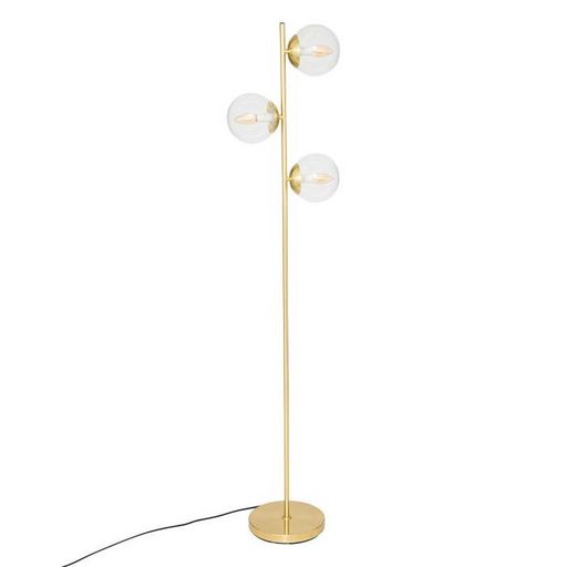Informations Techniques : Dimensions : L. 35 x l. 25 x H. 162 cm Matières : Verre, Métal & Sable Spécificités : Chic & Utile Design 3 globes Interrupteur à pied Forme ronde Ampoules non incluses À monter soi-même Poids : 4,4 kg Couleur : Or