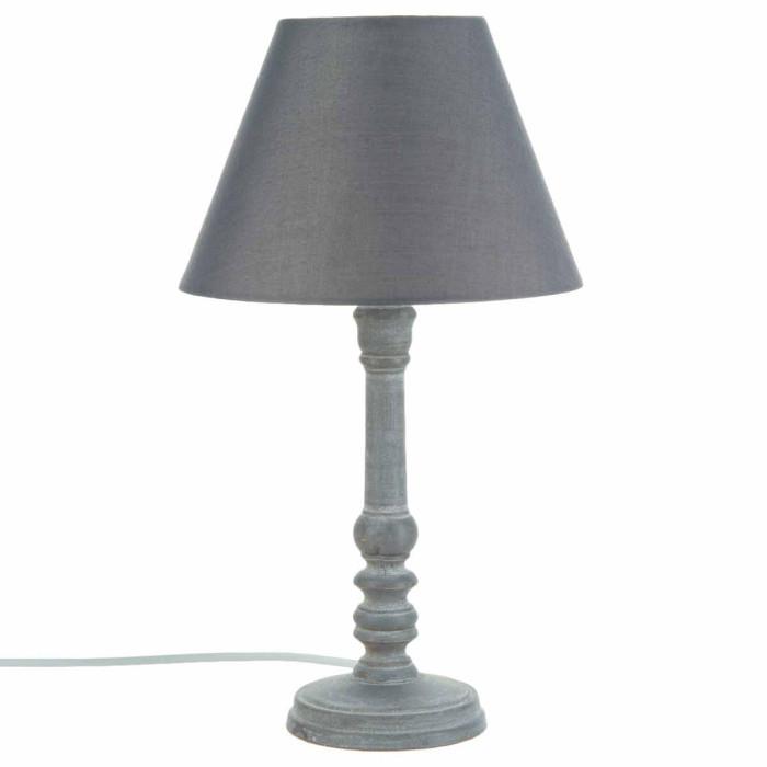 Informations Techniques : Dimensions : D. 19,8 x H. 36 cm Matières : Bois (Pin), Polyester & PVC Spécificités : Vintage & Romantique Lampe à Poser Alimentation : Secteur Type de Culot : E14 Puissance : 25W Couleur : Gris