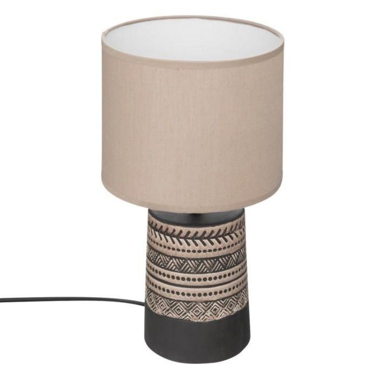 Informations Techniques : Dimensions : D. 18 x H. 34 cm Matières : Pied : Terre Cuite Abat-jour : Polyester, Coton & Métal Spécificités : Déco & Utile Motifs exotiques Interrupteur on/off Forme ronde Poids : 0,75 kg Couleur : Marron