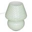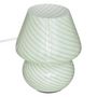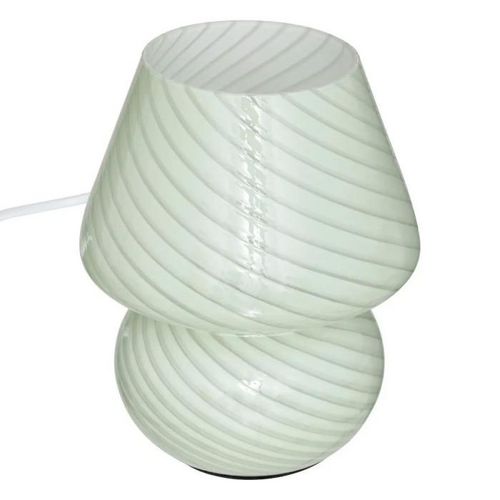 Informations Techniques : Dimensions : L. 15 x l. 15 x H. 18 cm Câble : L 150 cm Matière : Verre Spécificités : Rétro & Élégante Abat-jour strié Design champignon Douille : E14 Puissance : 25W IP : IP20 Poids : 0,61 kg Couleur : Vert