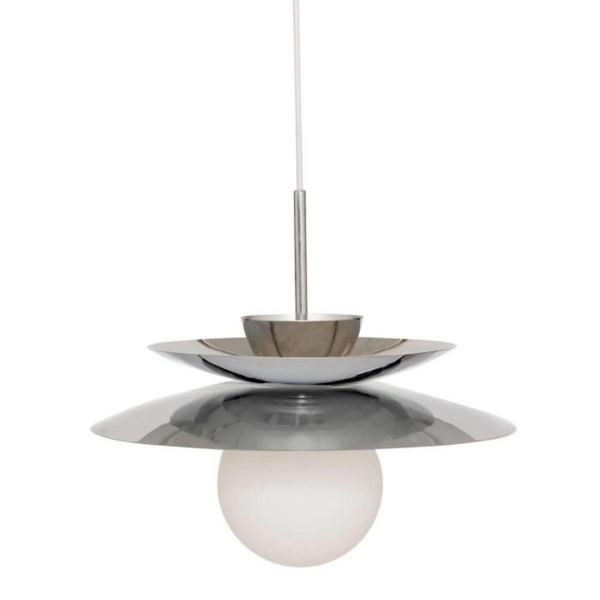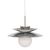 Informations Techniques : Dimensions : D. 38 x H. 125 cm Abat-jour : D. 38 x H. 32 cm Matières : Acier & Verre Spécificités : Élégante & Captivante Suspension design Abat-jour globe en verre Ampoule non incluse Douille : E14 Puissance : 40W Poids : 1,38 kg Couleur : Argent
