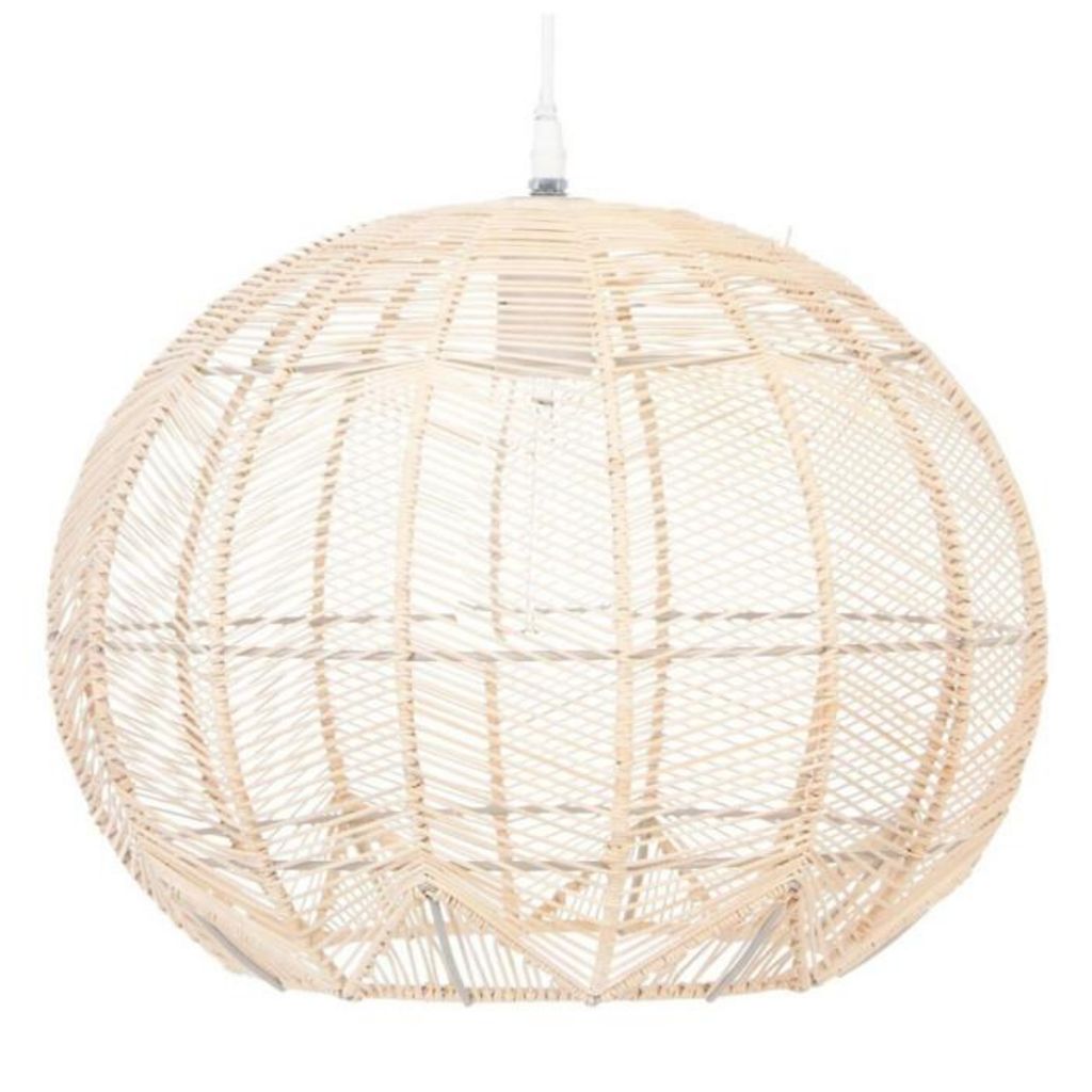 Informations Techniques : Dimensions : D. 38 x H. 32 cm Fil : L. 120 cm Base : D. 12 x H. 2 cm Matière : Rotin, Fer, Cuivre & PVC Spécificités : Poids : 1,3 kg Couleur : Beige