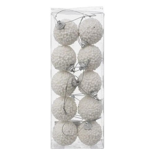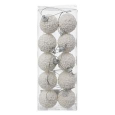 Informations Techniques : Dimensions : D. 4 cm Matière : Polystyrène Spécificités : Pratique et Déco Lot de 10 boules de Noël Avec petites billes déco 3D Forme ronde Poids : 0,003 kg Couleur : Blanc