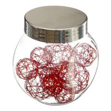 Informations Techniques : Dimensions : L. 7,5 x l. 5,3 x H. 7,6 cm Matière : Fer Spécificités : Pratique & Utile Lot de 10 Boules Déco Forme Ronde A utiliser comme Décoration de Table Bocal inclus Poids : 0,033 kg Couleur : Rouge