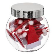 Informations Techniques : Dimensions : L. 7,5 x l. 5,3 x H. 7,6 cm Matière : Polyester Spécificités : Pratique & Utile Lot de 18 Bonnets de Noël Bocal inclus Idéal comme Décoration de Table Poids : 0,026 kg Couleur : Rouge & Blanc