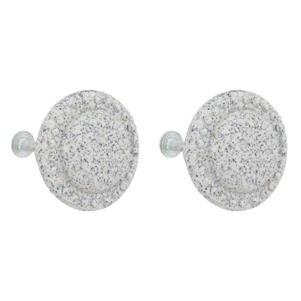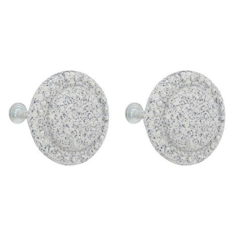 Informations Techniques : Dimensions : D. 4 x H. 4,6 cm Matières : Grès & Métal Spécificités : Déco & Nostalgique Lot de 2 boutons de meuble Avec motifs Forme ronde Poids : 0,04 kg Couleur : Gris Taupe