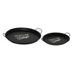 Informations Techniques : Dimensions : L. 50 x l. 44,50 x H. 6,50 cm 2 tailles différentes : D. 39,5 / 50 cm Matière : Métal Spécificités : Pratique & Utile Lot de 2 plateaux de services Avec poignées Inscription Maison Vintage Forme ronde Poids : 0,98 kg Couleur : Noir