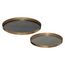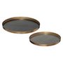 Informations Techniques : Dimensions : D. 43 x H. 2,7 cm 2 tailles différentes : D. 39 / 43 cm Matière : Métal Spécificités : Pratique & Élégant Lot de 2 plateaux de service Fonds imprimés Bordure en métal cuivré Forme ronde Poids : 0,9 kg Couleur : Or