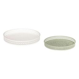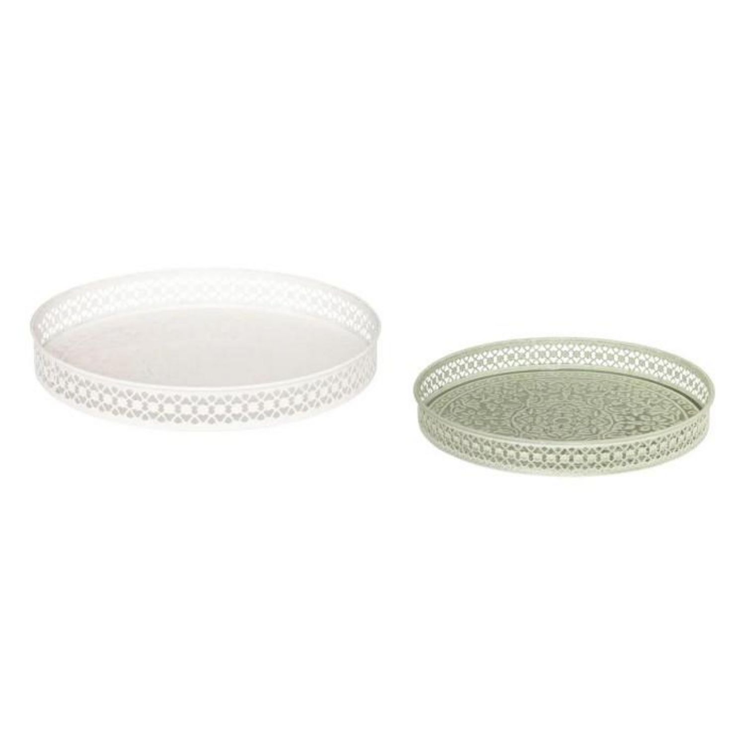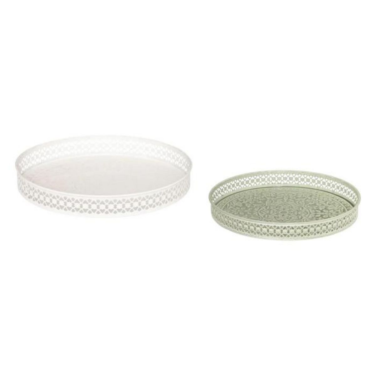 Informations Techniques : Dimensions : D. 31,7 x H. 4,3 cm Matière : Acier Spécificités : Déco & Design Lot de 2 plateaux ronds Motif mandala ton sur ton Poids max supporté : 2,6 kg Poids : 0,32 kg Couleur : Blanc & Vert