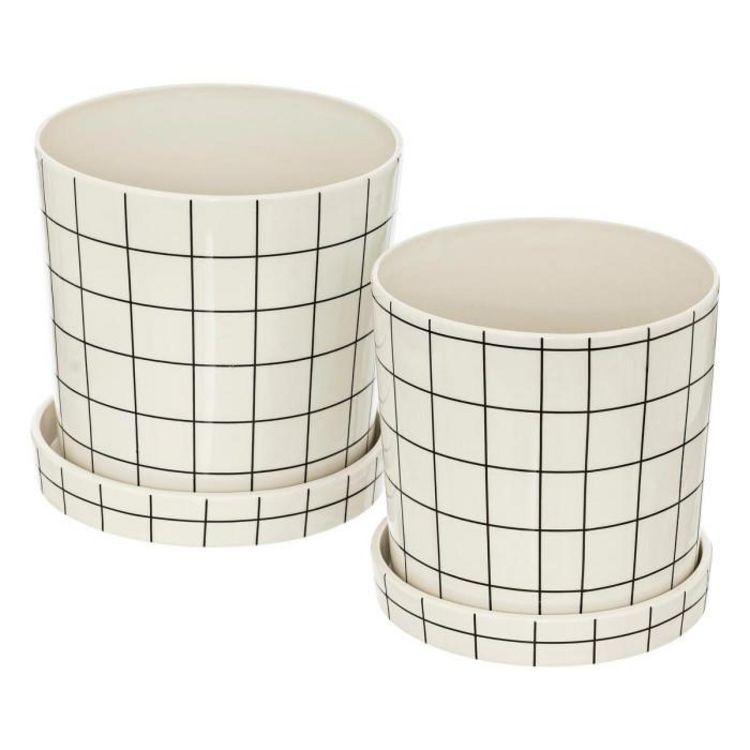 Informations Techniques : Dimensions : Taille 1 : D. 22 x H. 22,5 cm Taille 2 : D. 25 x H. 25,5 cm Matière : Dolomite Spécificités : Déco & Utile Lot de 2 pots design Imprimé à carreaux Coupelles incluses Poids : 3,35 kg Couleur : Blanc & Noir