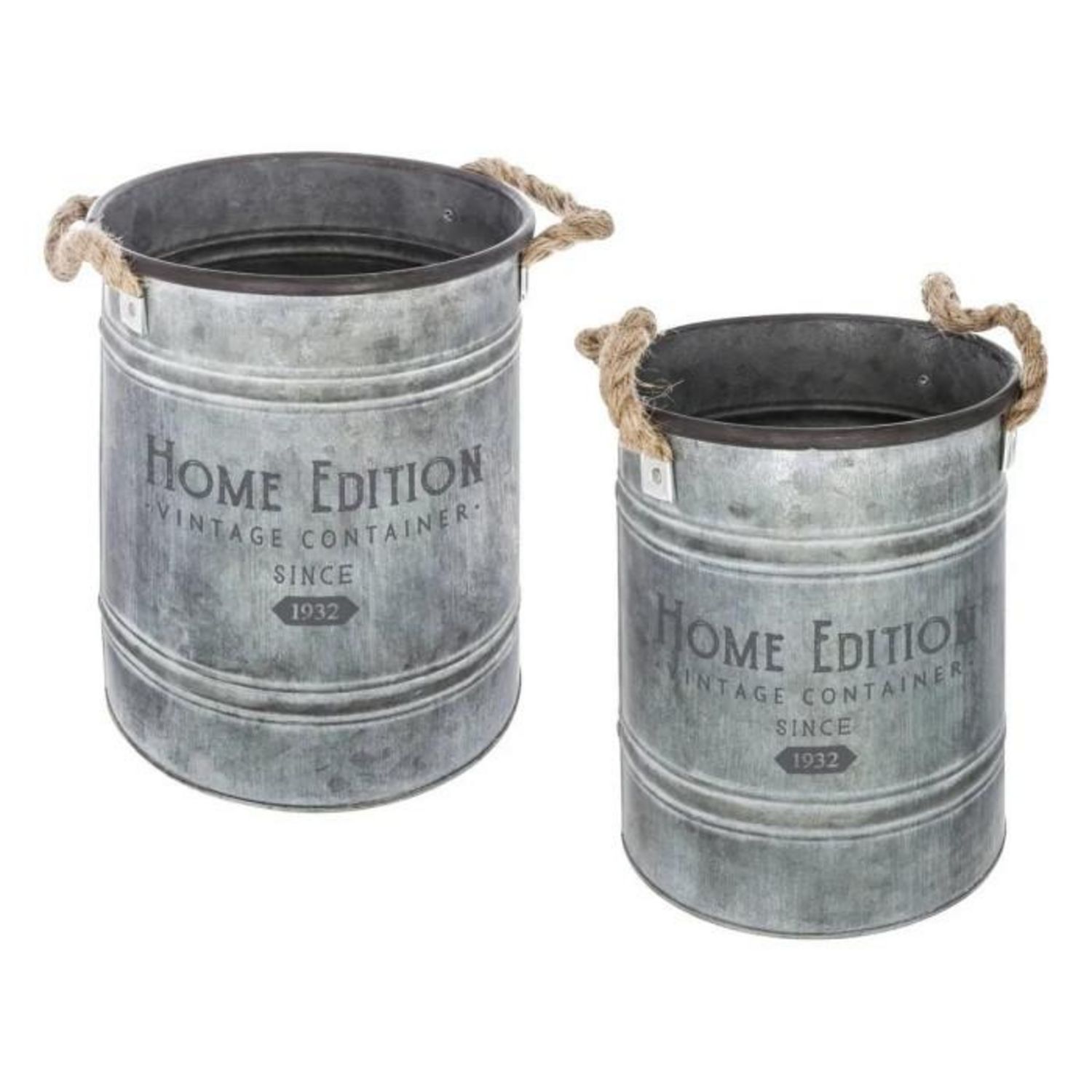 Informations Techniques : Dimensions : Seau 1 : D. 18,5 x H. 22 cm Seau 2 : D. 22,5 x H. 25 cm Matière : Zinc & Juge Végétale Spécificités: Vendu par lot de 2 Double Anse en Corde Poids : 0,790 kg Couleur : Gris