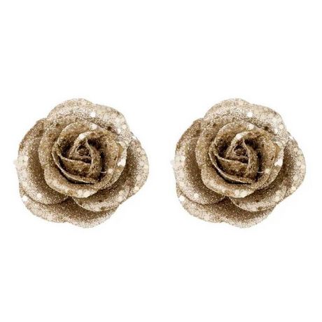 Informations Techniques : Dimensions : L. 6 x l. 4,5 x H. 6 cm Matière : Polyester Spécificités : Déco & Festif Lot de 2 sujets de Noël À accrocher Design roses pailletées Poids : 0,008 kg Couleur : Or