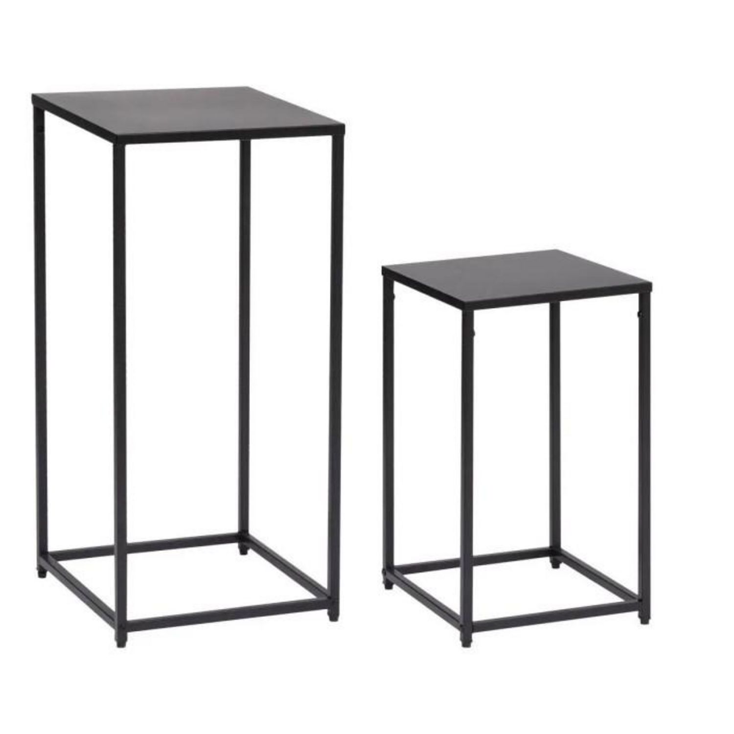 Informations Techniques : Dimensions : Taille 1 : L. 30 x l. 30 x H. 54,5 cm Taille 2 : L. 34 x l. 34 x H. 74 cm Matière : Acier Spécificités : Pratique & Utile Lot de 2 Tables à Café Forme Carrée A monter soi-même Poids : 5,5 kg Couleur : Noir