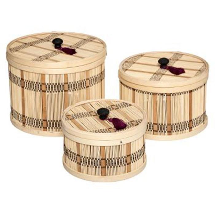 Informations Techniques : Dimensions : Taille 1 : D. 19 x H. 13,5 cm Taille 2 : D. 22 x H. 17,5 cm Taille 3 : D. 25 x H. 21,5 cm Matière : Bambou Spécificités : Pratique & Tendance Lot de 2 Boîtes déco Forme Ronde Style Ethnique Poids : 0,903 Kg Couleur : Naturel