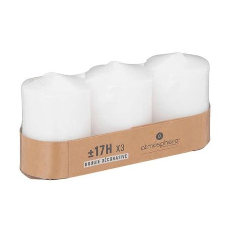 Informations Techniques : Dimensions : D. 5 x H. 7,5 cm Matière : Cire Spécificités : Pratique & Tendance Vendu par lot de 3 Durée de Combustion : 17 h Poids : 0,11 kg Couleur : Blanc