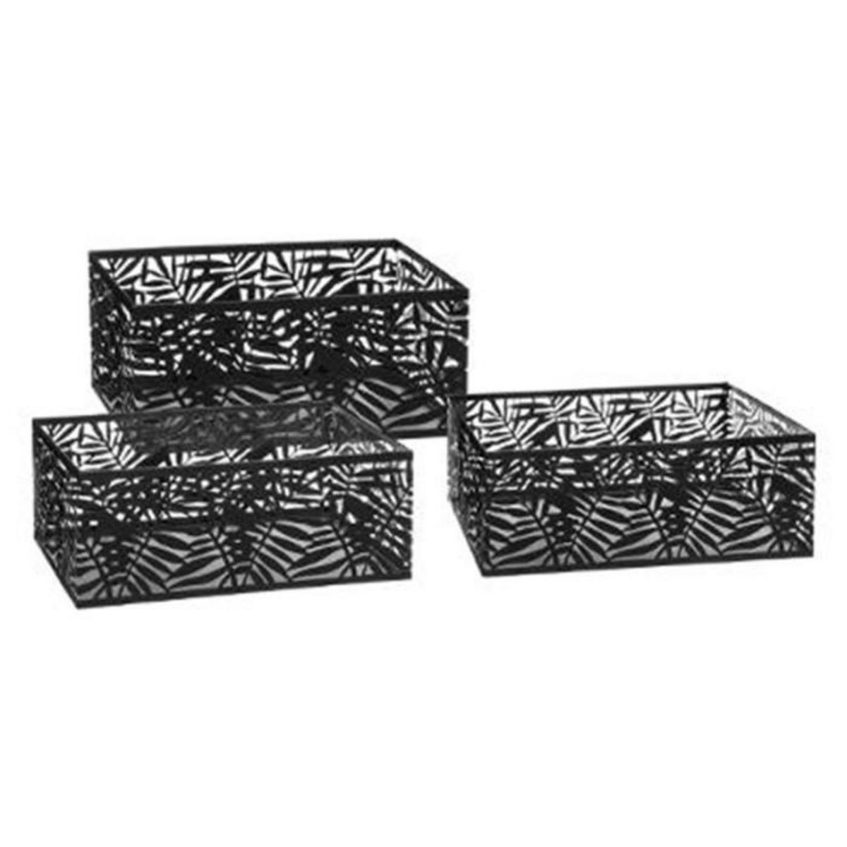 Informations Techniques : Dimensions : Taille 1 : L. 28 x l. 15 x H. 12 cm Taille 2 : L. 30 x l. 20 x H. 12 cm Taille 3 : L. 32 x l. 25 x H. 12 cm Matière : Fer Spécificités : Pratique & Tendance Lot de 3 Caisses de Rangement Forme Rectangulaire Effet Ajouré Facile d'Entretien & d'Utilisation Poids