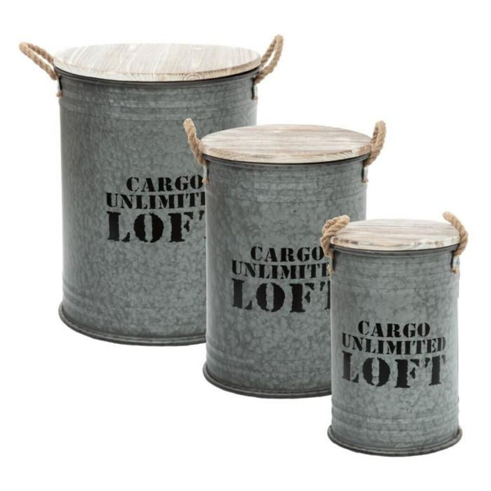 Informations Techniques : Dimensions : S : D. 27 x H. 41 cm M : D. 33,5 x H. 46,5 cm L : D. 40 x H. 51,5 cm Matière : Métal Spécificités : Design & Rétro Lot de 3 Inscription Cargo Unlimited Loft Poids : 7,15 kg Couleur : Gris