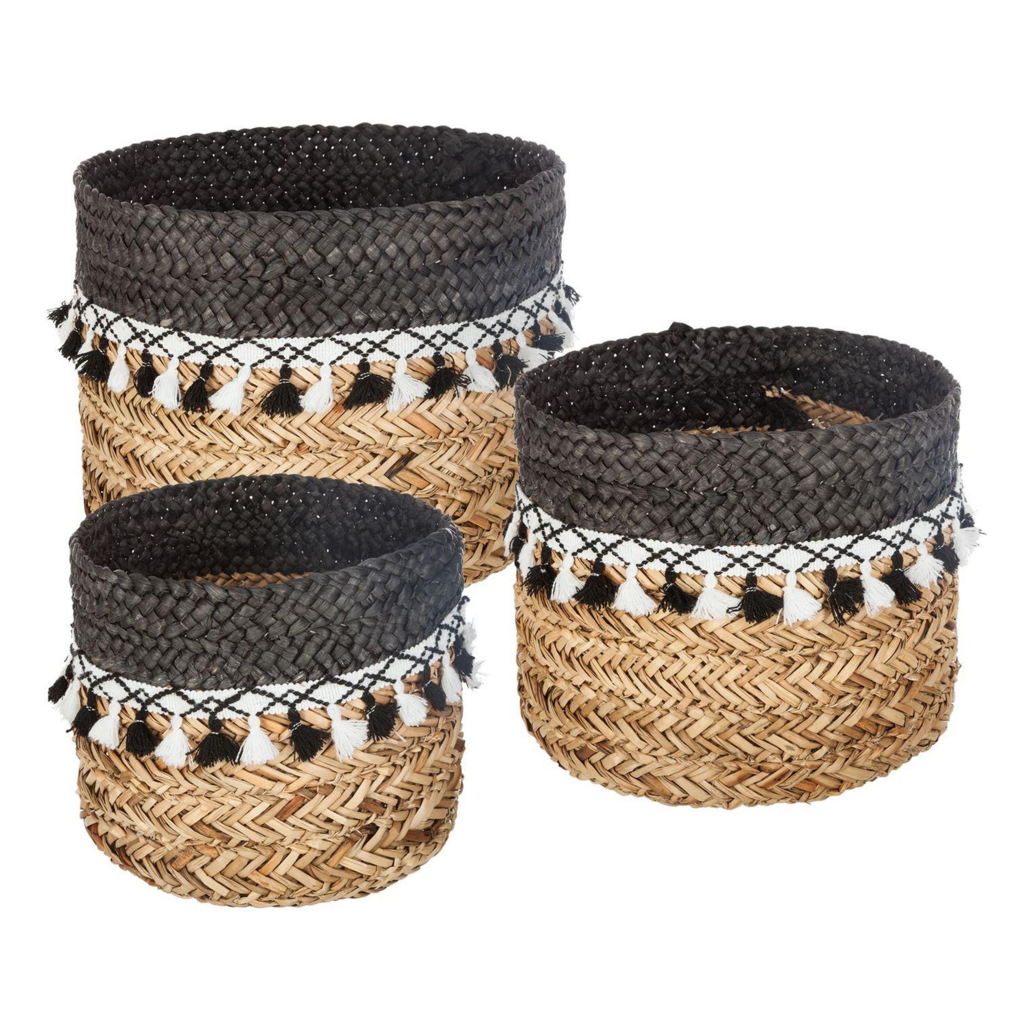 Lot de 3 Paniers en roseau à pompons - Noir et Blanc
