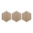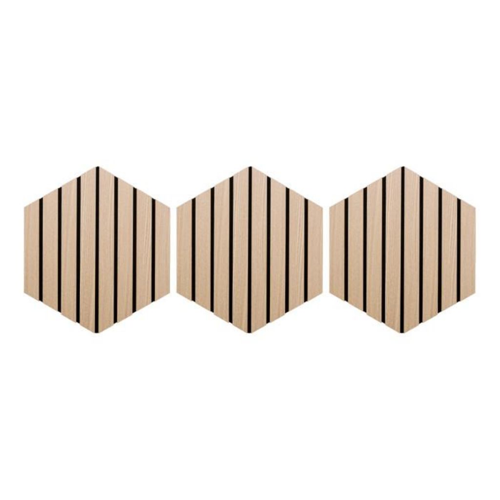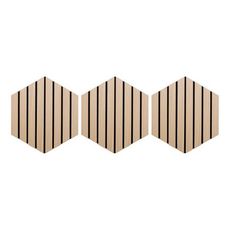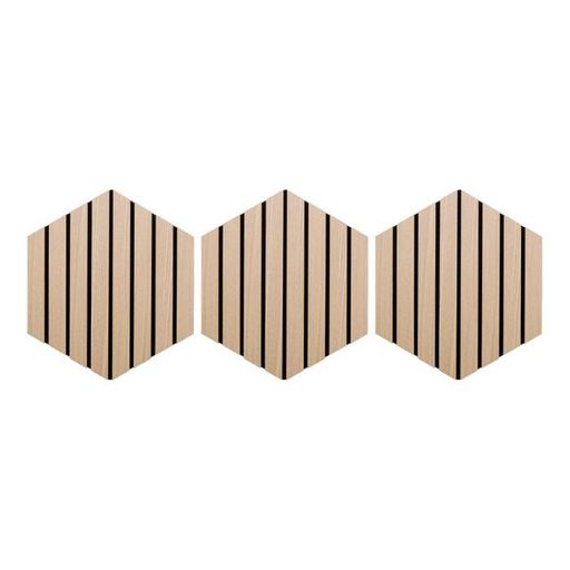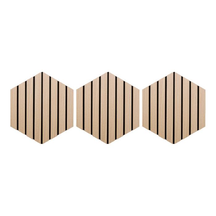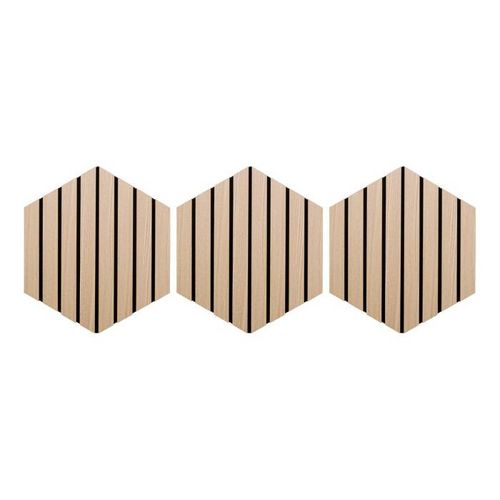Informations Techniques : Dimensions : L. 26 x l. 2,1 x H. 30 cm Matières : MDF & Polyester Spécificités : Pratique & Déco Lot de 3 panneaux décoratifs muraux Isolation acoustique Tasseaux réguliers Doublage en feutrine beige Forme hexagonale Effet chêne Facilement découpable Installation simple