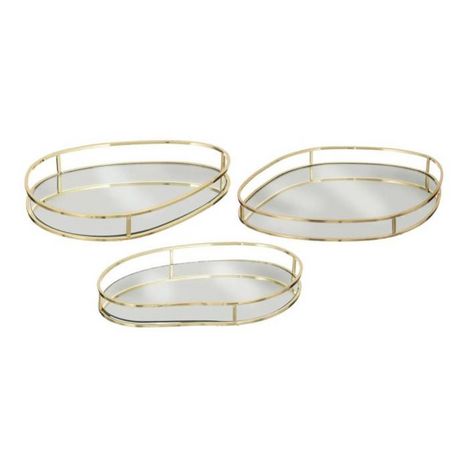 Informations Techniques : Dimensions : L. 30 x l. 25 x H. 3 cm 3 tailles différentes : L. 23,5 / 27 / 30 cm Matières : Métal & Verre Spécificités : Pratique & Chic Lot de 3 plateaux de présentation Avec rebords & fonds effet miroir Poids : 0,55 kg Couleur : Or