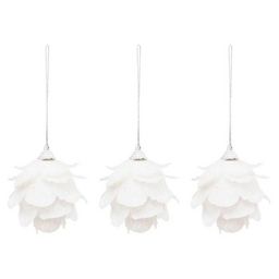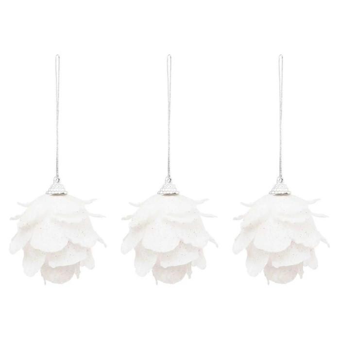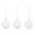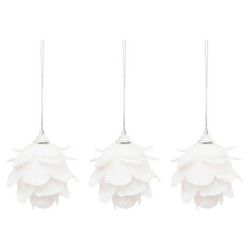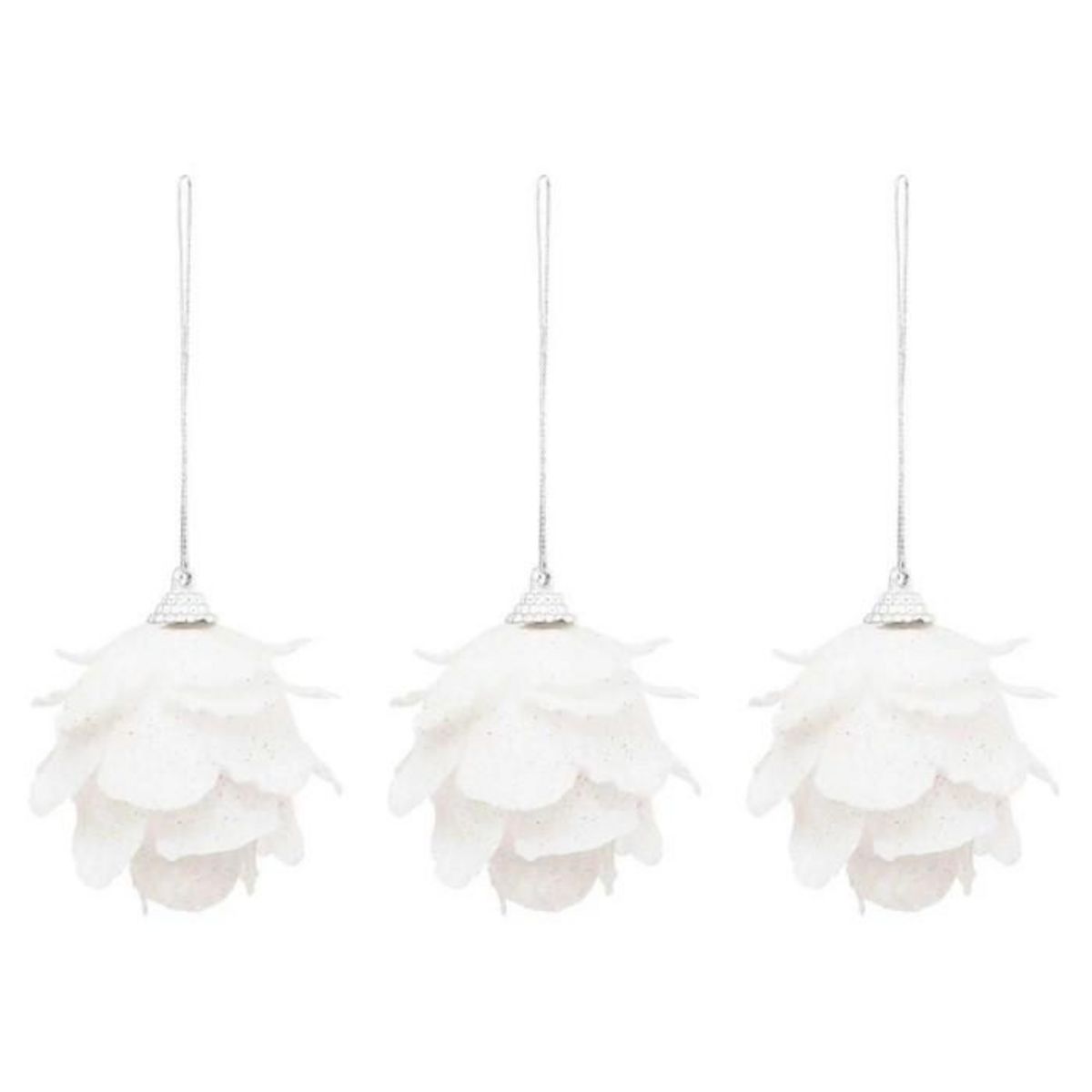 Informations Techniques : Dimensions : L. 7 x l. 7 x H. 7 cm Matières : Polystyrène & Polyester Spécificités : Déco & Festif Lot de 3 sujets de Noël à suspendre Design fleurs Avec paillettes Poids : 0,01 kg Couleur : Blanc