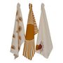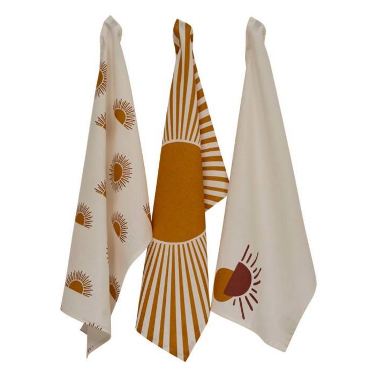 Informations Techniques : Dimensions : L. 70,1 x l. 45 x H. 0,1 cm Matière : 100% Coton (170g/m2) Spécificités : Pratique & Déco Lot de 3 torchons imprimés Motifs solaires variés Lavage à 30°C Poids : 0,19 kg Couleur : Ocre