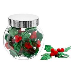 Informations Techniques : Dimensions : L. 7,5 x l. 5,3 x H. 7,6 cm Feuille : L. 4 x l. 5 cm Matière : Polyester Spécificités : Pratique & Utile Lot de 30 Feuilles de Houx Bocal inclus Idéal comme Décoration de Table Poids : 0,027 kg Couleur : Vert & Rouge