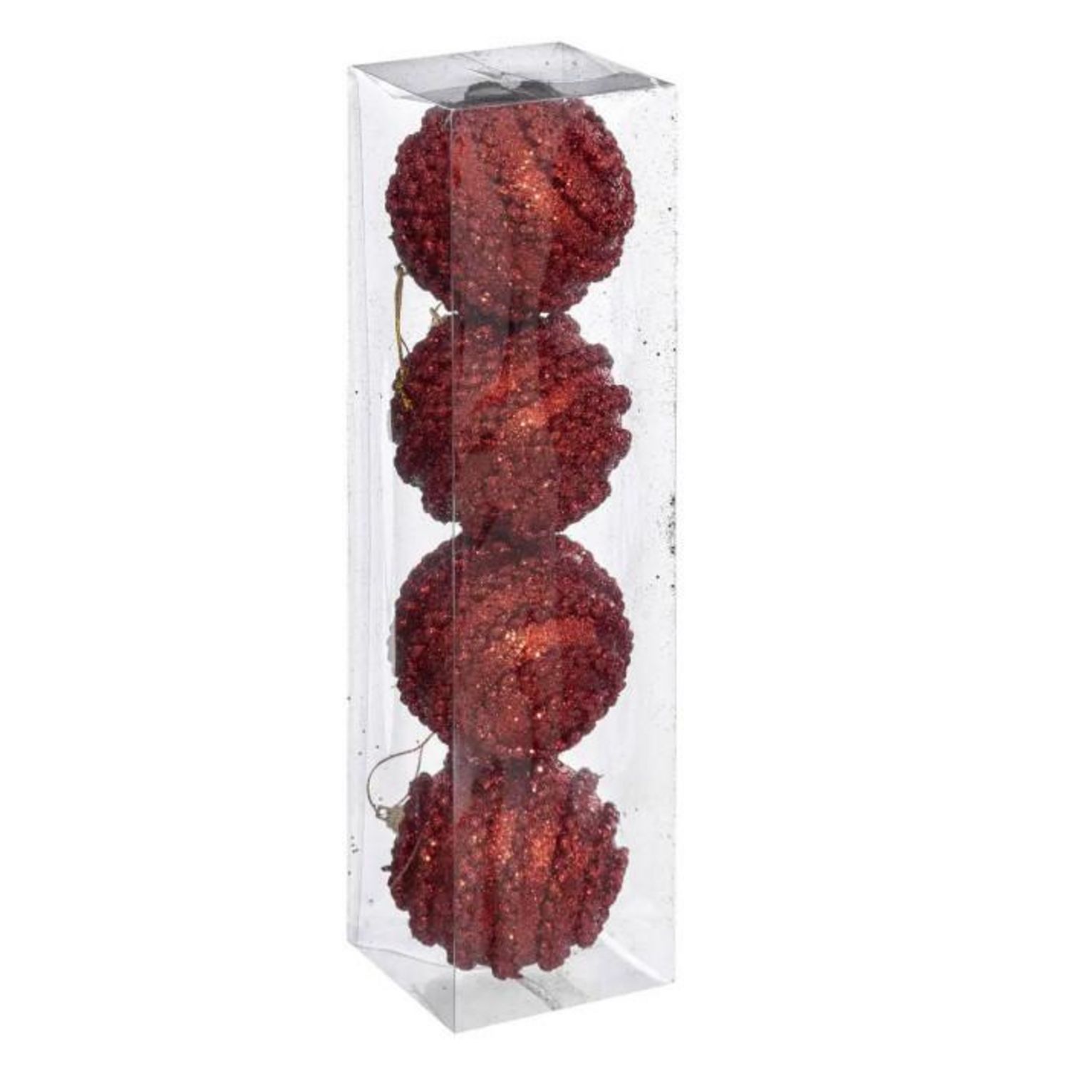 Informations Techniques : Dimensions : D. 8 x H. 8 cm Matière : Polystyrène Spécificités : Pratique & Utile Lot de 4 Boules de Noël Forme Ronde Effet Maille Poids : 0,006 kg Couleur : Rouge