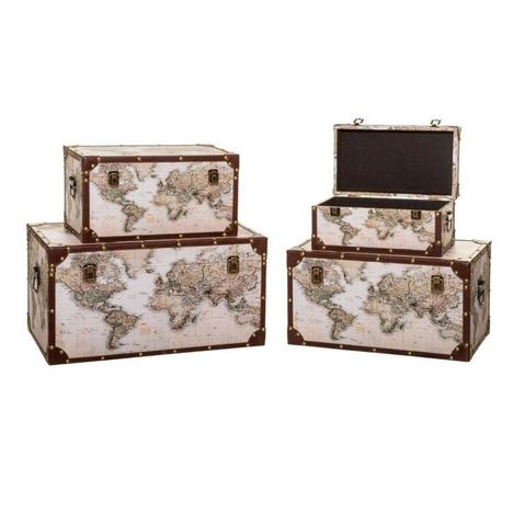 Informations Techniques : Dimensions : Petite : L. 34 x l. 19 x H. 16 cm Moyenne : L. 40 x l. 24 x H. 21 cm Grande : L. 48 x l. 29 x H. 25 cm Plus grande : L. 56 x l. 34 x H. 29 cm Matière : MDF & Nylon Spécificités : Pratique & Déco Vendu en lot de 4 Motif mappemonde imprimé Facile d'entretien et