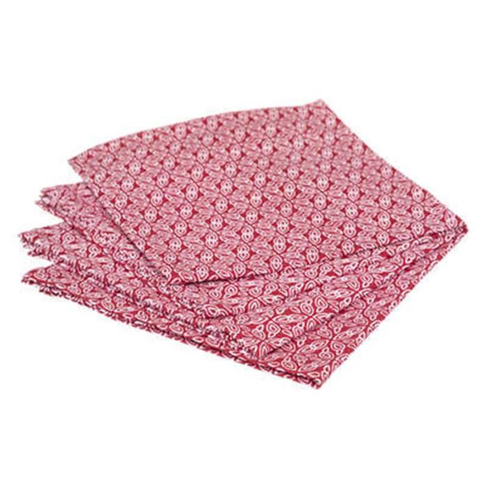 Informations Techniques : Dimensions : L. 40 x l. 0,5 x H. 40 cm Matière : Coton Spécificités : Pratique & Utile Lot de 4 Serviettes de Table Forme Carrée Motif Imprimé Finition avec Ourlet Poids : 0,145 kg Couleur : Rouge