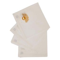 Informations Techniques : Dimensions : L. 40 x l. 40 x H. 0,1 cm Matière : 100% Coton (170g/m2) Spécificités : Pratique & Déco Lot de 4 serviettes de table Motifs solaires imprimés Lavage à 30°C Poids : 0,15 kg Couleur : Blanc & Ocre