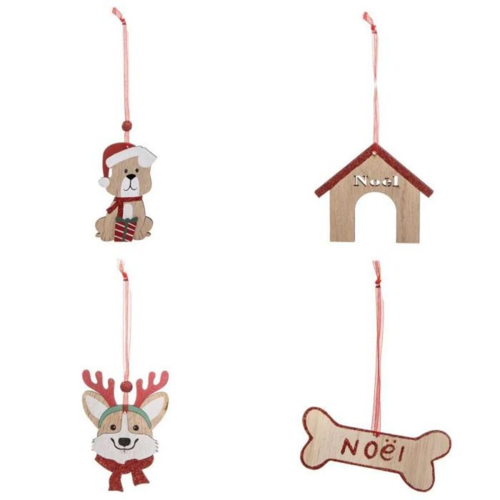 Informations Techniques : Dimensions : L. 8 x l. 0,5 x H. 12,5 cm Matière : Bois Spécificités : Pratique & Utile Lot de 4 Sujets de Noël Design Chien Poids : 0,043 kg Couleur : Beige & Rouge