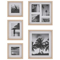 Ce lot de 5 cadres photos vous permettra de laisser libre cours à votre imagination. De forme carrée ou rectangulaire et avec différents formats, ces cadres en bois mettront joliment en valeur vos souvenirs. Les passe-partout peuvent s'enlever. À accrocher au mur, en position verticale ou horizontale.