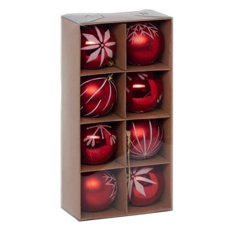 Informations Techniques : Dimensions : D. 8 x H. 9,2 cm Matière : PS Spécificités : Pratique & Utile Lot de 8 boules de Noël 4 designs différents Forme ronde Poids : 0,27 kg Couleur : Rouge & Blanc
