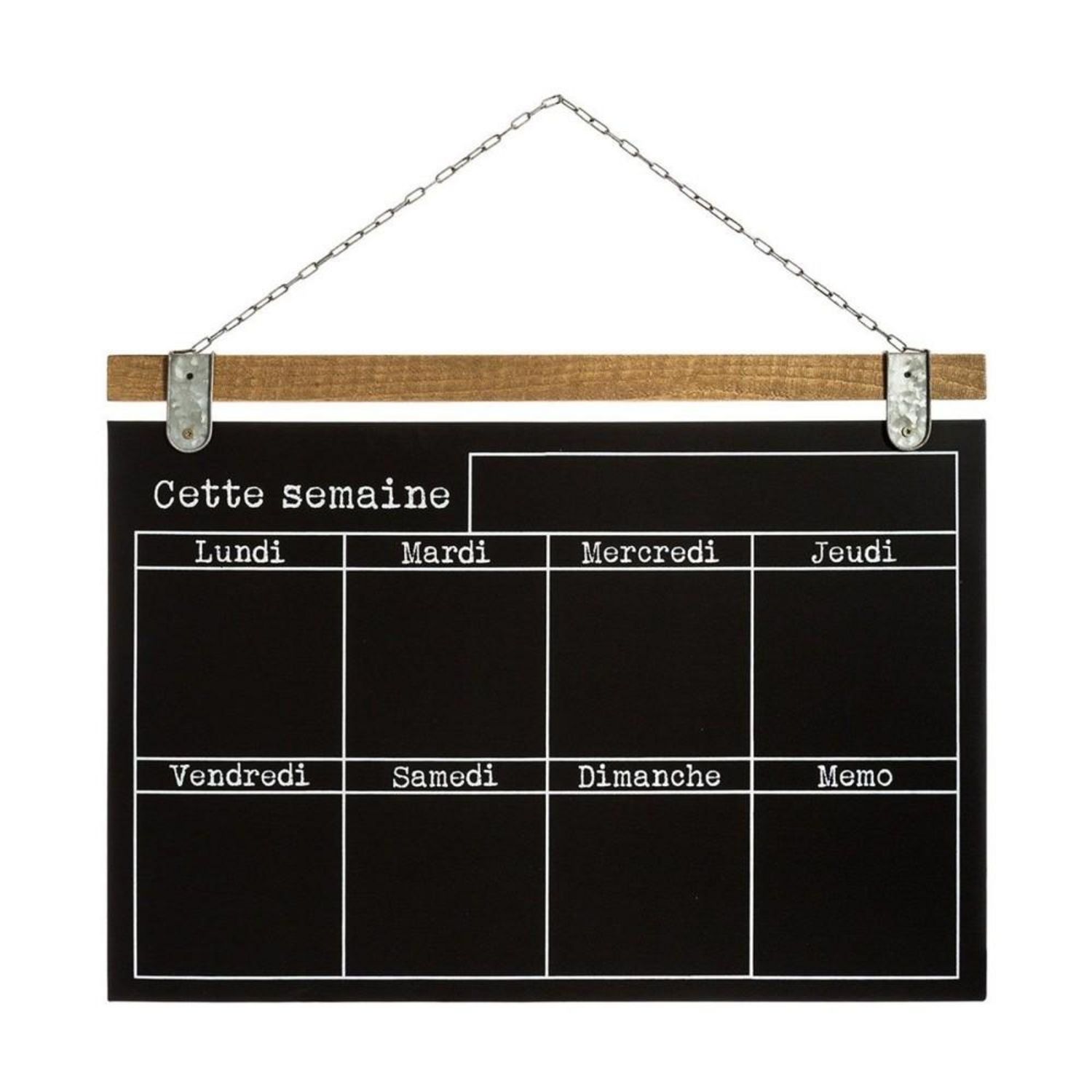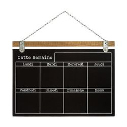 Mémo semainier ardoiseComplétez votre décoration pratique avec ce magnifique mémo semainier ardoise de dimension 69x50 cm pour laisser des messages et ne jamais plus rien oublier tout au long de la semaine.Très pratique avec ses 7 cases par jour de la semaine et une case pour les notes, vous ne manquerez plus aucun rendez-vous !Informations sur le mémo semainier ardoise :Dimensions : L. 69 x l. 1,5 x H. 50 cmMatière : pin, ferPoids : 1,7 kgA accrocher au mur