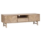 Conçu comme une enfilade, le meuble TV Aeris d'Atmosphera offre une longueur généreuse. Doté de 2 portes à chacune des extrémités, il dispose d'un tiroir central et d'une ouverture passe câble au dos. Réalisé en bois d'acacia, il se distingue par l'aspect chevronné de la finition. Avec ses pieds au