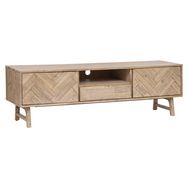 Conçu comme une enfilade, le meuble TV Aeris d'Atmosphera offre une longueur généreuse. Doté de 2 portes à chacune des extrémités, il dispose d'un tiroir central et d'une ouverture passe câble au dos. Réalisé en bois d'acacia, il se distingue par l'aspect chevronné de la finition. Avec ses pieds au style brut et artisanal, ce meuble vous permettra de dissimuler vos lecteurs et accessoires pour rendre votre coin TV propice à l'évasion. Résistant et facile d'entretien, il se mariera idéalement avec des matières naturelles.
